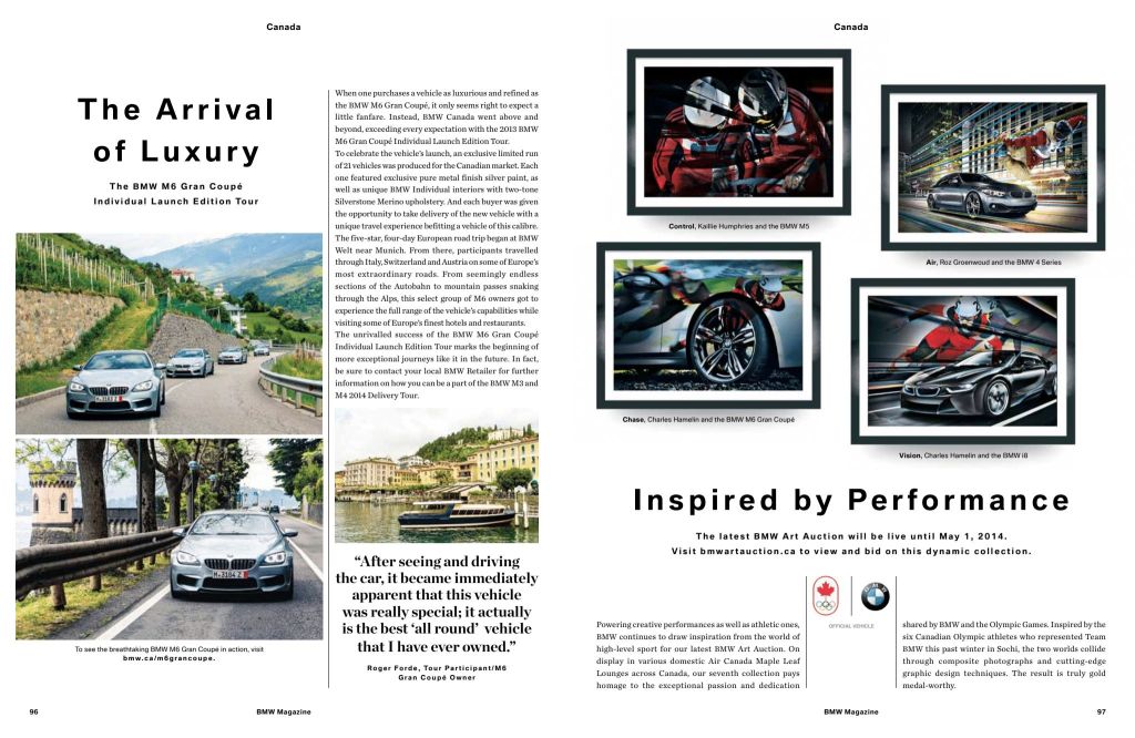 Bringing to life the drive, passion and energy of all things BMW, DRIVEN was a publication created exclusively for BMW owners. At the time of this publication, the print edition was published twice yearly, with a circulation of approx. 3.8 million copies. Its pages embodied the brand’s pioneering spirit and enviable style. Featuring articles on the arts, fashion and design, interwoven with news about the latest BMW innovations, it was my pleasure to pitch, research and write articles to add a Canadian perspective to this internationally-enjoyed magazine.